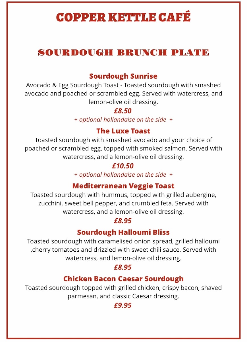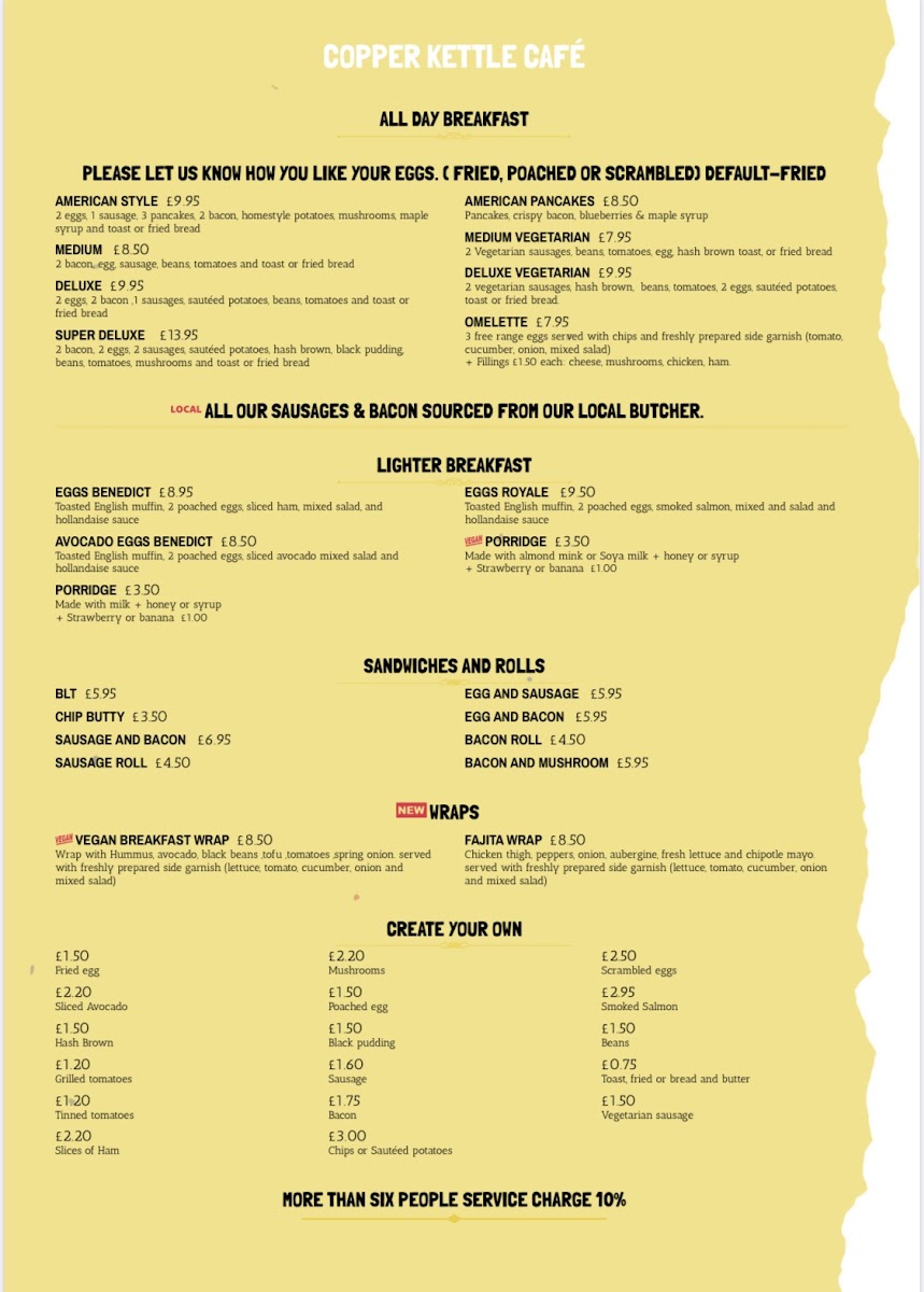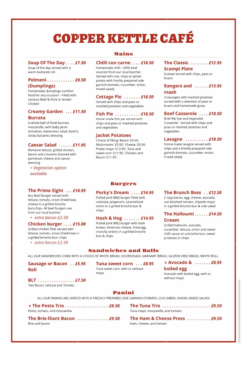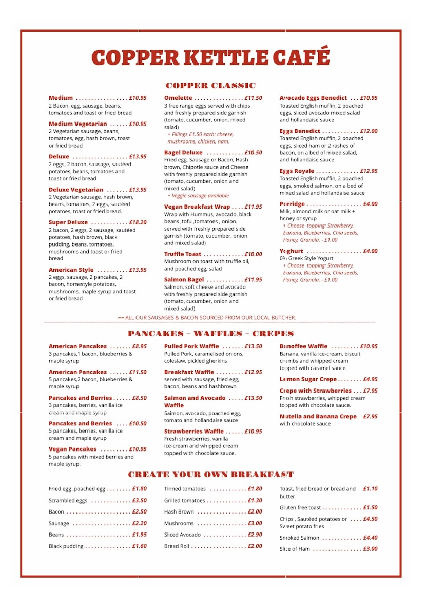 The Copper Kettle’s menu is a well-balanced mix of hearty classics and inventive twists, each dish reflecting careful attention to both flavor and presentation. Breakfast options like the Custom Full English Breakfast and Avocado Eggs Benedict cater to traditional and modern palates alike, while the Salmon and Avocado Waffle adds a creative flair that surprises without overwhelming. Lunch and dinner offerings are equally satisfying, with the Burger and Fries delivering comfort in every bite and the Fish and Chips maintaining a crisp, golden perfection. Sweet selections such as American Pancakes provide indulgence, and the light, refreshing Smoothie complements the heavier fare perfectly. For those seeking a touch of Scandinavian influence, the Pickled Herring with Potatoes offers a tangy, flavorful option that stands out among the menu’s variety. Each dish demonstrates The Copper Kettle’s commitment to quality ingredients and thoughtful preparation, making the menu versatile enough to appeal to both casual diners and those looking for something a bit more distinctive. Overall, the menu strikes a harmonious balance between traditional favorites and innovative creations, ensuring a memorable dining experience from the first bite to the last.